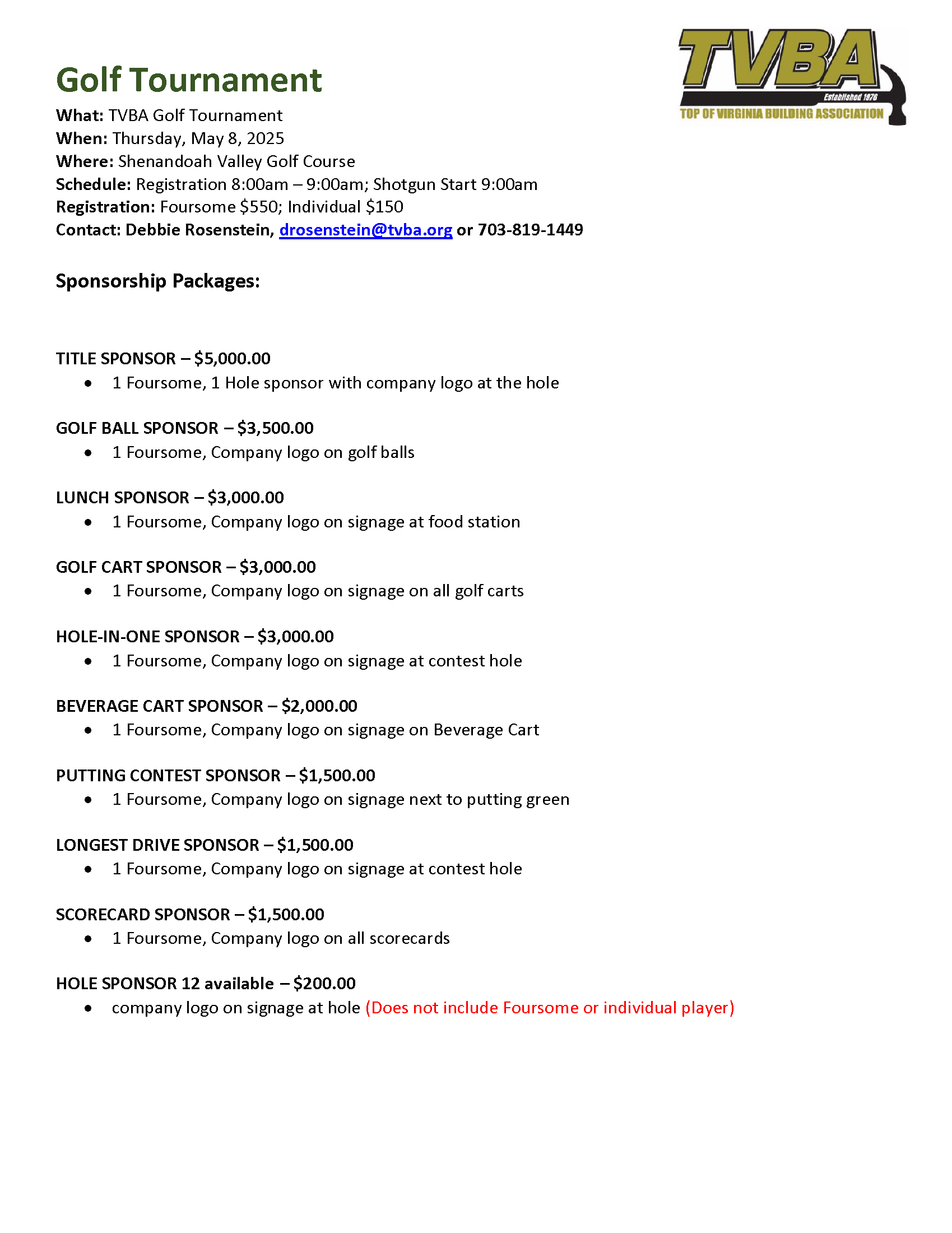 Sponsorships available! Please contact jmcdonald@tvba.org for more information!